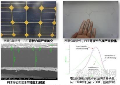 可能形成原因:在強(qiáng)UV光照射下,UV光穿透EVA,對膠層聚胺酯產(chǎn)生破壞,產(chǎn)生C-C共厄雙鍵有色基團(tuán);當(dāng)膠層降解后,UV直接照射到PET層,導(dǎo)致PET分子鏈降低,出現(xiàn)粉化現(xiàn)象,導(dǎo)致機(jī)械性能下降,絕緣失效,嚴(yán)重情況可導(dǎo)致背板開裂。