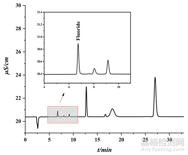 色譜柱:Metrosep A Supp7色譜柱(250 mm×4.0 mm, 5.0 μm)+Metrosep A Supp 5 Guard 保護(hù)柱(50 mm×4.0 mm, 5.0 μm);流動相:5.0 mmol/L碳酸氫鈉+1.0 mmol/L無水碳酸鈉;流速:0.8 mL/min;柱溫:45℃;進(jìn)樣體積:20 μL;檢測器:電導(dǎo)檢測器;化學(xué)抑制器:MSN-A;抑制器再生液:200 mmol/L硫酸+5%丙酮(體積分?jǐn)?shù));等度洗脫。
