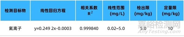 ▲ 表1 氟離子的線性方程、相關(guān)系數(shù)、線性范圍、檢出限和定量限
