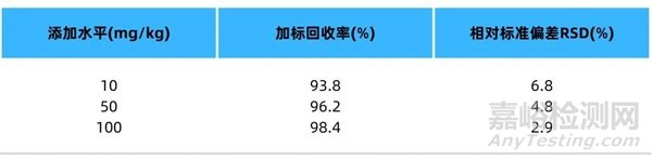 ▲ 表2 氟離子在不同添加水平下的回收率和精密度(n=6)