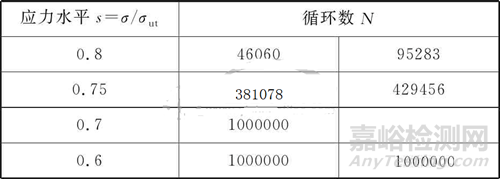 對V型缺口試樣的剪切疲勞試驗進行完成之后,得到如下疲勞數(shù)據(jù),見表2。剪切強度計算結果與試驗測試結果相差不大,在每個應力水平下疲勞試樣的累計循環(huán)次數(shù)也都在一個數(shù)量級之內(nèi),屬于可接受范圍。其中在應力水平為0.7以下時,試驗循環(huán)數(shù)到達106沒有破壞,認為材料到達疲勞極限。