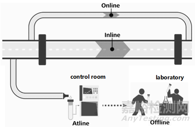 基于傳感器安裝位置和測量原理的不同,PAT在線檢測概括起來主要有3種類型:①近線檢測 (at-line);②在線檢測 (on-line);③線內(nèi)檢測 (in-line)。傳統(tǒng)檢測方式主要是離線檢測(off-line)。為了便于理解四種類型的差異,見圖2。