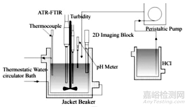 Ma等研究了L-谷氨酸的結(jié)晶過程,采集了不同溶液濃度、不同粒徑和不同溫度的L-谷氨酸溶液 NIR光譜,結(jié)合遺傳算法和支持向量機(jī)兩種方法建立校正模型,該模型最終通過驗(yàn)證,可以成功地應(yīng)用于L-谷氨酸冷卻結(jié)晶過程監(jiān)控。Lee等運(yùn)用 NIR光譜技術(shù)對吲哚美辛的反溶劑結(jié)晶過程進(jìn)行監(jiān)控,采用主成分分析對 NIR光譜進(jìn)行分析,成功實(shí)現(xiàn)了對吲哚美辛反溶劑結(jié)晶過程中晶型和晶體粒徑的實(shí)時(shí)監(jiān)控。系統(tǒng)示意圖,見圖6。