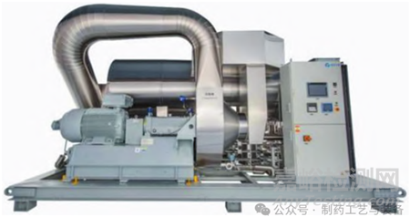 VCS12000/H 熱壓式蒸餾水機(如圖 2 所示)利用高能效蒸汽壓縮機壓縮,經多級分離產生純蒸汽,通過壓縮機把電能轉換成熱能,提高二次蒸汽的熱焓,并使其繼續(xù)進入蒸發(fā)器進行汽水換熱,可最大限度地降低外部工業(yè)蒸汽的消耗,依靠蒸汽機械再壓縮技術實現(xiàn)低成本制備注射用水[5],生產能力是 8~12 t/h。相比多效蒸餾水機,熱壓式蒸餾水機具有節(jié)約能耗、產水量大等特點[6-7]。