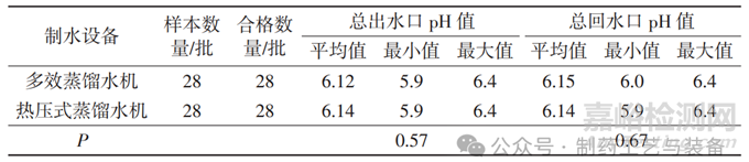 對本公司 2019 年 1—7 月采用多效蒸餾水機生產的注射用水和 2019 年 9 月至 2020 年 3 月采用熱壓式蒸餾水機生產的注射用水的質量進行比較。取樣點分為熱壓式蒸餾水機和多效蒸餾水機的總出水口和總回水口 4 個點,取樣頻次為每周取樣 1 次,共取樣 28 周。檢測指標包括性狀、pH 值、氨、硝酸鹽、亞硝酸鹽、電導率、總有機碳、不揮發(fā)物、重金屬、細菌內毒素和微生物限度。