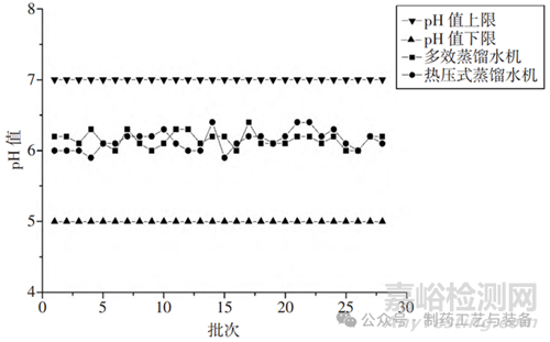 圖3 多效蒸餾水機和熱壓式蒸餾水機總出水口注射用水的pH值比較