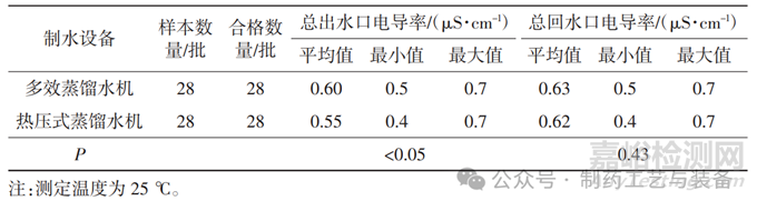 結果:多效蒸餾水機和熱壓式蒸餾水機制備的注射用水的質量均符合《中華人民共和國藥典》(2020 年版)的要求,且熱壓式蒸餾水機制備的注射用水的電導率比多效蒸餾水機更低。