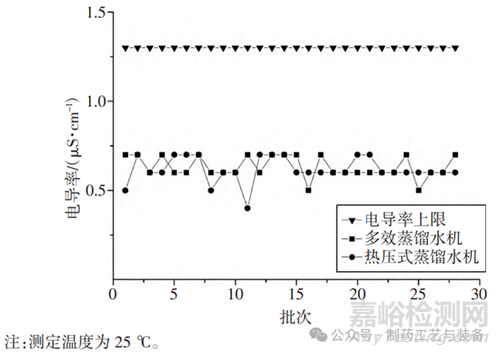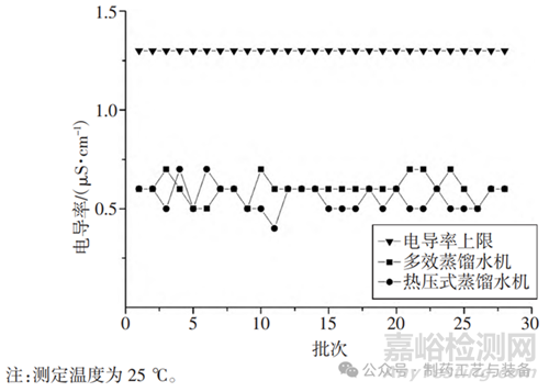 圖6 多效蒸餾水機和熱壓式蒸餾水機總回水口注射用水的電導率比較