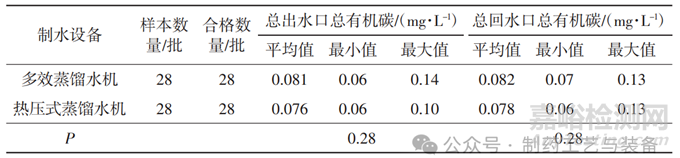 表3 2種設備制備的注射用水的總有機碳指標結果
