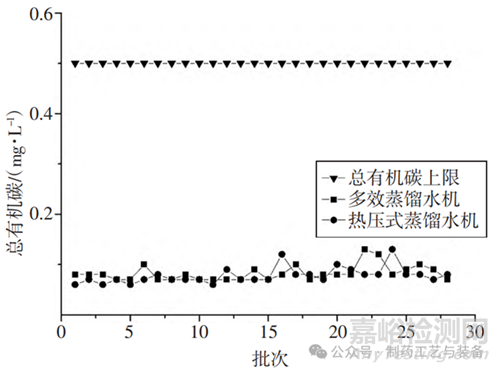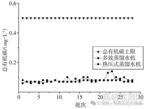 圖7 多效蒸餾水機和熱壓式蒸餾水機總出水口注射用水的總有機碳比較