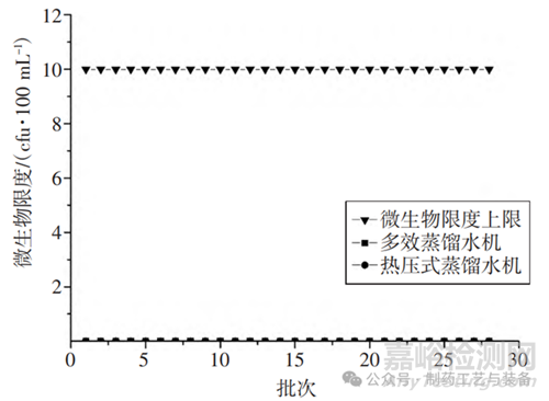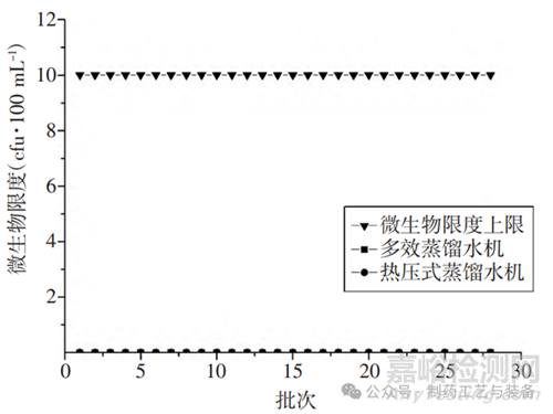 圖10 多效蒸餾水機和熱壓式蒸餾水機總回水口注射用水的微生物限度比較