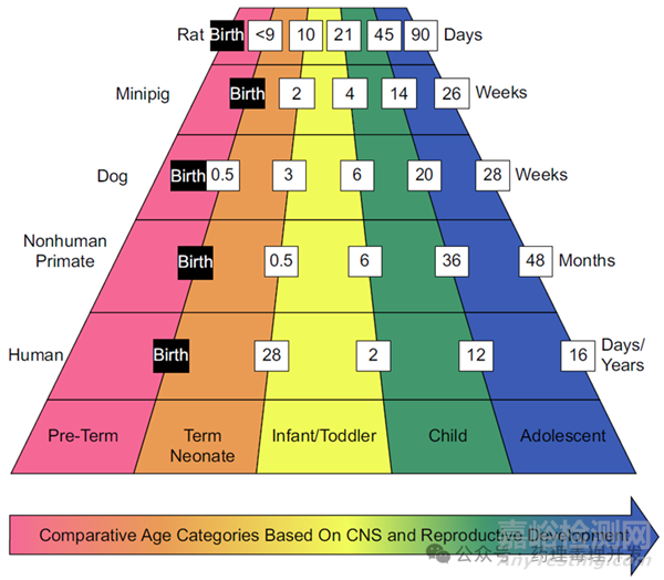 研究用動(dòng)物所屬年齡段與臨床擬暴露人群的年齡應(yīng)該具有可比性,給藥起始年齡應(yīng)與臨床擬用最小年齡相當(dāng)。下圖是不同種屬動(dòng)物和人體年齡對(duì)比示例圖。