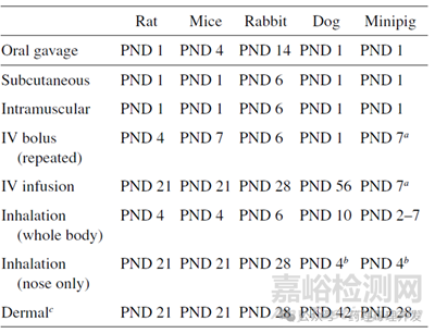 幼齡動(dòng)物一般不太建議從出生當(dāng)天就開(kāi)始給藥,有可能會(huì)影響動(dòng)物的存活率。根據(jù)給藥途徑不同,種屬不同,允許最早起始給藥時(shí)間如下表所示。