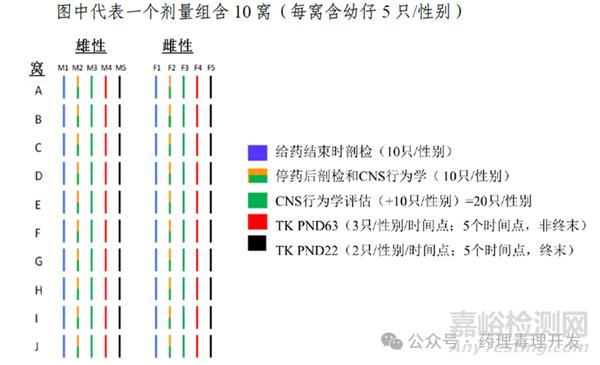 ICH S11推薦的分組方案是先構(gòu)建標(biāo)準(zhǔn)窩,大多數(shù)幼仔與自然母親仍然在一起,每窩幼仔數(shù)標(biāo)準(zhǔn)化(比如5雌5雄),10窩為1個(gè)劑量組,下圖所示就是1個(gè)劑量組的動(dòng)物組成,A-J代表10窩,每窩10只動(dòng)物,5雌和5雄代表了5個(gè)亞組,分別用于不同的試驗(yàn)?zāi)康模械氖墙o藥結(jié)束剖檢用,有的是TK用,有的是CNS行為學(xué)評(píng)估用。這種設(shè)計(jì)有點(diǎn)類似整窩設(shè)計(jì),通過(guò)多窩組合減少窩效應(yīng)和遺傳效應(yīng)等混雜因素影響。