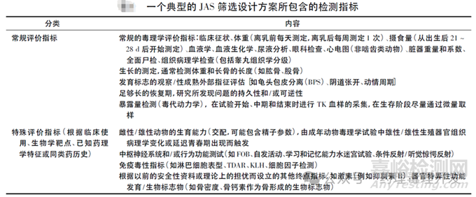 檢測(cè)指標(biāo):通常,幼齡動(dòng)物毒理研究需要關(guān)注出生后器官發(fā)育的影響比如骨骼、腎臟、肺、神經(jīng)、免疫系統(tǒng)和生殖系統(tǒng)。終點(diǎn)指標(biāo)應(yīng)包括很多生長(zhǎng)相關(guān)指標(biāo)如冠臀長(zhǎng)度、股骨和脛骨長(zhǎng)度、性成熟的外部指征、體重、體征、臨床病理學(xué)、器官重量、大體解剖和鏡檢。下圖摘自黃芳華、王慶利等CDE老師發(fā)表的《幼齡動(dòng)物毒理學(xué)研究: 試驗(yàn)設(shè)計(jì)、實(shí)施和結(jié)果分析》一文,除了常規(guī)指標(biāo),還需要結(jié)合藥物的靶點(diǎn)生物學(xué)特征、前期成年動(dòng)物毒理學(xué)數(shù)據(jù)、臨床使用等case by case的設(shè)置針對(duì)性特殊評(píng)價(jià)指標(biāo)。