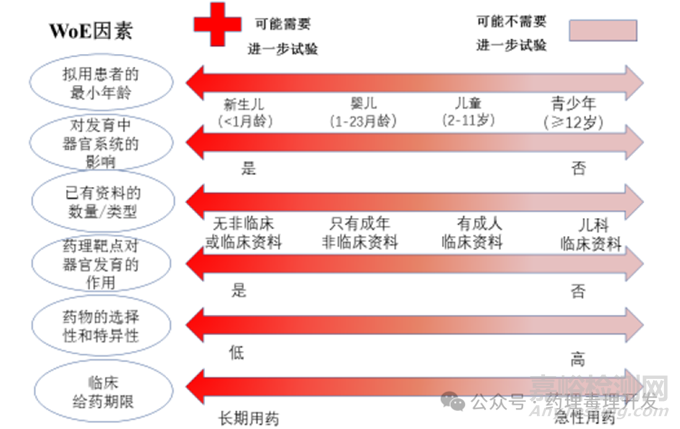籠統(tǒng)的講,當(dāng)現(xiàn)有的臨床數(shù)據(jù)、非臨床數(shù)據(jù)不能支持藥物在兒童患者中的安全性時(shí),幼齡動(dòng)物的非臨床研究就有了必要性。比如:1)同類型產(chǎn)品(包括同靶點(diǎn)、同作用機(jī)制、相似機(jī)制等)如果已經(jīng)有針對(duì)幼齡動(dòng)物毒性的擔(dān)憂;2)本品的臨床研究已有充分?jǐn)?shù)據(jù)提示潛在的風(fēng)險(xiǎn);3)非臨床成年動(dòng)物研究數(shù)據(jù)顯示出發(fā)育毒性風(fēng)險(xiǎn),或者提示有某些方面的特別擔(dān)憂,需開(kāi)展進(jìn)一步研究,如毒性的可逆性、充分的安全窗口探索等;4)現(xiàn)有臨床、非臨床安全性數(shù)據(jù)對(duì)于擬用于兒童的支持是不充分的。對(duì)于大部分藥物,在用于兒童之前,其實(shí)已經(jīng)有了成年人的安全性和有效性數(shù)據(jù),甚至有些已經(jīng)有12歲以上未成年患者的數(shù)據(jù)??梢越Y(jié)合已有的臨床前和臨床數(shù)據(jù),科學(xué)合理設(shè)計(jì)幼齡動(dòng)物的研究方案。ICH S11對(duì)于是否需要額外開(kāi)展幼齡動(dòng)物非臨床安評(píng),建議進(jìn)行證據(jù)權(quán)重分析,其中最重要的考量因素是臨床擬用患者的最小年齡以及對(duì)發(fā)育中器官系統(tǒng)是否有可疑影響,其它考量因素還包括前期資料完整度、藥物靶點(diǎn)對(duì)器官發(fā)育的作用、藥物的選擇性和特異性等,如下圖所示。ICH S11附錄中關(guān)于證據(jù)權(quán)重分析決定幼齡動(dòng)物非臨床安評(píng)是否需要開(kāi)展給出了多個(gè)案例,可以參考。