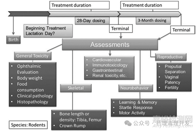 幼齡動(dòng)物毒理研究多以嚙齒類為主,先從整體看下一項(xiàng)嚙齒類幼齡動(dòng)物毒理試驗(yàn),如下圖所示。除了常規(guī)體重、攝食量、臨床病理、組織病理學(xué)檢查、眼科檢查外,需要特別關(guān)注骨骼、神經(jīng)系統(tǒng)、生殖系統(tǒng)、心血管系統(tǒng)等發(fā)育情況。另外,可以考慮將功能觀察組合測(cè)試(functional observation battery, FOB)嵌入一般毒性試驗(yàn)中。