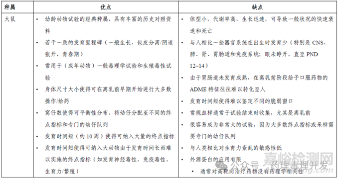 種屬選擇方面,選擇依據(jù)與成年動(dòng)物類似。如果前期已經(jīng)完成成年動(dòng)物毒理研究,且已經(jīng)有成年人體數(shù)據(jù),F(xiàn)DA、EMA、ICH均認(rèn)為采用一種最相關(guān)種屬開(kāi)展幼齡動(dòng)物毒理研究即可。來(lái)自10家藥企的39個(gè)幼齡動(dòng)物毒理數(shù)據(jù)顯示,大鼠是最常用種屬。但是,如果擬開(kāi)發(fā)產(chǎn)品是兒科專用或先是兒科的適應(yīng)癥,這種情況下沒(méi)有前期成年動(dòng)物、臨床數(shù)據(jù)支持,通常需要在兩個(gè)種屬(嚙齒+非嚙齒)幼齡動(dòng)物中開(kāi)展研究,感興趣的可翻閱下脊髓性肌萎縮癥治療藥物諾西那生鈉(nusinersen,商品名Spinraza)的相關(guān)資料。大鼠作為最常用種屬,優(yōu)點(diǎn)是比較經(jīng)典,歷史對(duì)照資料豐富,發(fā)育時(shí)間短,可進(jìn)行大量發(fā)育重點(diǎn)指標(biāo)的考察,易于操作等。當(dāng)然,大鼠也有其局限性,具體優(yōu)、缺點(diǎn)如下表所示。