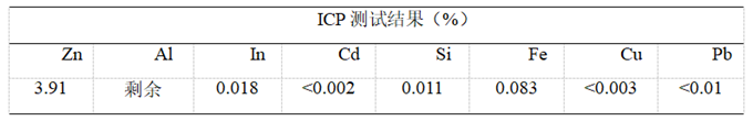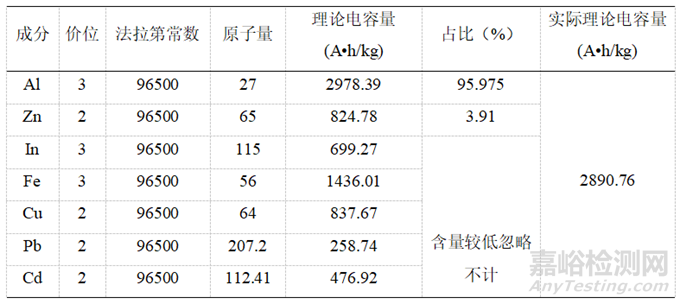 如表2所示,鋁陽極樣品由電感耦合等離子光譜測定其成份,活性物及雜質含量符合要求。通過實測成份計算陽極的實際理論電容量,結果如表3所示。