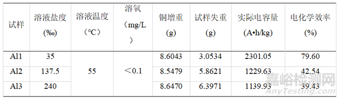 1)本文中的鋁陽極(Al-Zn-In-Si)在高溫低氧環(huán)境中,隨著鹽度升高,電化學容量和電化學效率顯著降低,這可歸因于高鹽(高氯離子)環(huán)境,更易誘發(fā)和加劇鋁陽極的晶間腐蝕。
