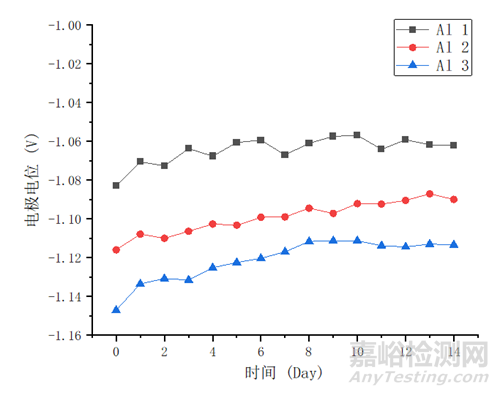 測試過程中依據標準要求,測試陽極試樣在22.3mA恒流電解下的電極電位,結果如圖2所示。其中,橫坐標0處代表陽極的開路電位。