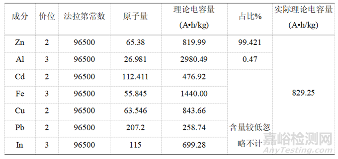 同樣,鋅陽極樣品由電感耦合等離子光譜測定其成份(表5),活性物及雜質含量符合要求,通過實測成份計算陽極的實際理論電容量(表6)。