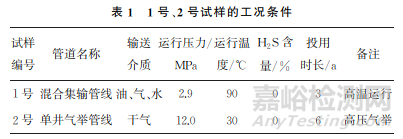 取油、氣、水混合集輸管線樣和單井氣舉管試樣,分別編號為1號和2號,1號、2號試樣的工況條件如表1所示,宏觀形貌分別如圖1,2所示。
