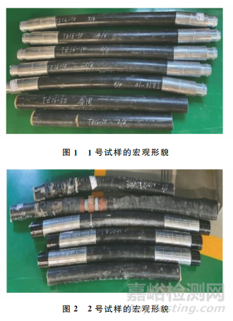 隨著油氣田開發(fā)中后期出水量的增加,腐蝕環(huán)境越來越惡劣,迫切需要用耐腐蝕、耐熱、耐壓的非金屬管材解決地面集輸系統(tǒng)的腐蝕問題,其中柔性復(fù)合管是一種在油田應(yīng)用廣泛的非金屬管材。截至2022年12月,塔里木油田中應(yīng)用的柔性復(fù)合管已達1611km,且呈逐年遞增趨勢。為探究柔性復(fù)合管在油氣集輸環(huán)境中的應(yīng)用效果,對該油氣田在役的2條柔性復(fù)合管取樣并進行分析,以確定不同服役環(huán)境對柔性復(fù)合管性能的影響程度,分析結(jié)果可為后續(xù)柔性復(fù)合管的正確使用起到一定的指導(dǎo)作用。依據(jù)SY/T 6662.2—2020 《石油天然氣工業(yè)用非金屬復(fù)合管 第2部分:柔性復(fù)合高壓輸送管》要求,對2條柔性復(fù)合管進行結(jié)構(gòu)解剖,采用宏觀觀察、微觀分析、水壓爆破試驗、氣密封性能測試、結(jié)構(gòu)組成分析、熱分析、紅外光譜分析、力學(xué)性能測試等方法對2條柔性復(fù)合管進行分析,以確定2條柔性復(fù)合管在不同工況下的適用性。