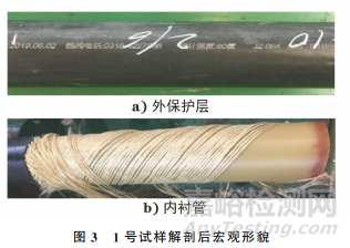 對1號試樣管體進行解剖并觀察其宏觀形貌,結(jié)果如圖3所示。由圖3可知:外保護層噴碼顯示設(shè)計溫度為60℃,在內(nèi)襯管外部纏繞有2層深黃色的纖維繩作為增強結(jié)構(gòu)層;整體來看,該柔性復(fù)合管服役后外保護層、增強層及內(nèi)襯層結(jié)構(gòu)保持完整,未見開裂、鼓包等缺陷,但內(nèi)襯管因溶脹作用變?yōu)樯铧S色。
