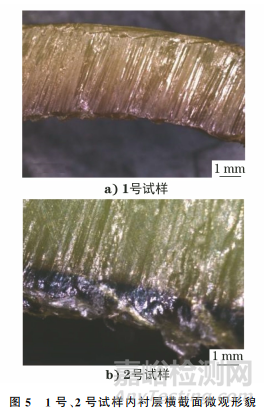 對2號試樣管體進行解剖并觀察其宏觀形貌,結(jié)果如圖4所示。由圖4可知:2號試樣外保護層完整,增強層為非黏接型交叉纏繞的4層纖維干紗,各層纖維纏繞方向一致、排列整齊,未出現(xiàn)斷裂、錯排等現(xiàn)象;內(nèi)襯管整體光滑平整,未見明顯的開裂、鼓包、起泡等缺陷,但內(nèi)襯管顏色變?yōu)闇\黃色。
