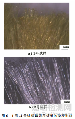 1號、2號試樣增強層纖維的微觀形貌如圖6所示,可見兩試樣纖維束結(jié)構(gòu)均保持完整,未見纖維斷裂、纏結(jié)等現(xiàn)象。