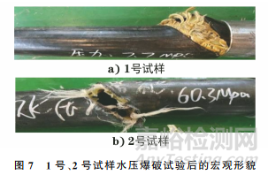 對1號、2號試樣進行水壓爆破試驗,結(jié)果如表2所示,試驗后兩試樣的宏觀形貌如圖7所示。由表2及圖7可知:兩試樣水壓爆破的失效形式均為管體爆破,扣壓接頭完好。但1號試樣爆破壓力不滿足SY/T 6662.2—2020的要求(≥11.4MPa)。