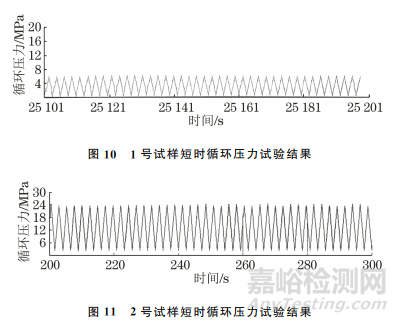 圖10,11分別是1號和2號試樣短時循環(huán)壓力試驗結(jié)果,1號試樣在試驗壓力為0~6.0MPa的條件下,經(jīng)7000次短時循環(huán)壓力試驗后,未發(fā)生破裂、泄漏現(xiàn)象;2號試樣在試驗壓力為2.4~24.0MPa的條件下,經(jīng)7000次短時循環(huán)壓力試驗后,未發(fā)生破裂、泄漏現(xiàn)象,兩試樣的試驗結(jié)果均滿足SY/T 6662.2—2020的要求。