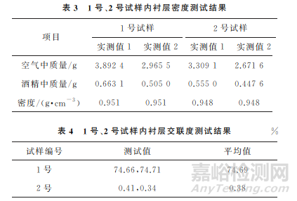 1號、2號試樣內(nèi)襯層的密度和交聯(lián)度測試結(jié)果分別如表3,4所示。由表3,4可知:1號、2號試樣內(nèi)襯層密度均滿足GB/T 15558.1—2015 《燃氣用埋地聚乙烯(PE)管道系統(tǒng) 第1部分:管材》的要求(≥0.930g/cm3);1號試樣內(nèi)襯層為交聯(lián)聚乙烯,2號試樣內(nèi)襯層為普通聚乙烯。