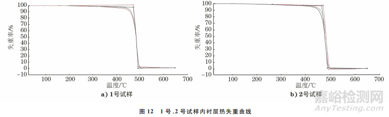 圖12是1號、2號試樣內(nèi)襯層熱失重曲線,可見1號、2號試樣內(nèi)表面和外表面的熱失重變化曲線相差不大。