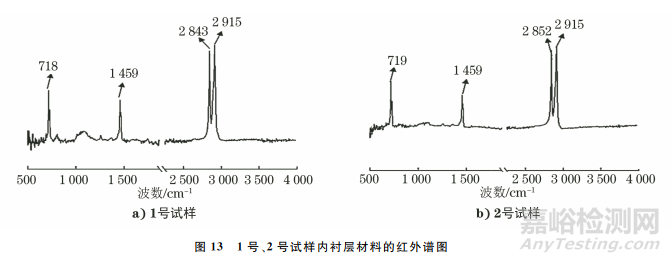 1號、2號試樣內(nèi)襯層材料的紅外譜圖如圖13所示。由圖13可知:兩試樣紅外譜圖中聚乙烯的特征吸收峰(2915,2843,2852cm-1)明顯,除聚乙烯特征峰外,還在718~1459cm-1處出現(xiàn)了C—C骨架彎曲振動吸收峰,而醚類中C—O—C不對稱伸縮振動吸收峰(1262cm-1)和環(huán)氧乙烷基團中C—O—C伸縮振動吸收峰(807cm-1)也在這一范圍內(nèi),但峰強較弱,說明醚類和環(huán)氧乙烷的含量較少,判斷其來源于滲透的油介質(zhì)。
