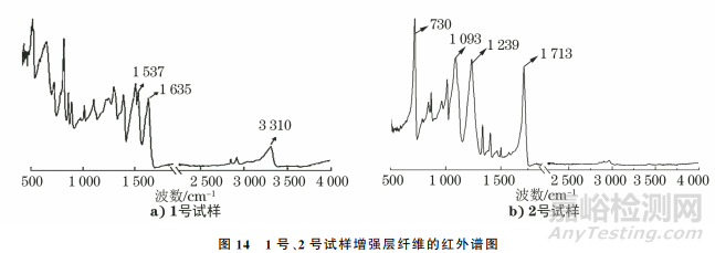 1號、2號試樣增強層纖維的紅外譜圖如圖14所示。由圖14可知:1號試樣譜圖中3310cm-1處為-NH伸縮振動吸收峰,1635cm-1和1537cm-1處為—CO—NH—彎曲振動吸收峰,證明增強層芳綸纖維服役后的化學(xué)成分未發(fā)生明顯變化;2號試樣譜圖中1713cm-1處為羰基伸縮振動峰,1239cm-1和1093cm-1 處為羧基中的羰基伸縮振動峰,2800~3000cm-1處為—CH2—振動峰,730cm-1處為面外彎曲振動吸收峰,873cm-1處為芳環(huán)上兩個相鄰的C—H變形振動峰,證明增強層滌綸纖維服役后的化學(xué)成分未發(fā)生明顯變化。