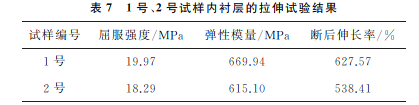 1號、2號試樣內(nèi)襯層的拉伸試驗結(jié)果如表7所示。由表7可知:1號、2 號試樣斷后伸長率均滿足GB/T 15558.1—2015的要求 (≥350%),但根據(jù)SY/T 7415—2018 《油氣集輸管道內(nèi)襯用聚 烯烴管》,高密度聚乙烯的屈服強度應(yīng)不小于20MPa,因此1號、2號試樣服役后內(nèi)襯層的屈服強度均下降。