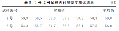1號、2號試樣內(nèi)襯層的硬度測試結(jié)果如表8所示。由表8可知:1號、2 號試樣內(nèi)襯層的平均硬度分別為59.0,56.0HD。