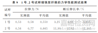1號、2號試樣增強層纖維的力學(xué)性能測試結(jié)果如表9所示。由表9可知:1號試樣的拉伸力小于2號試樣,因為滲入內(nèi)襯層和增強層之間的油氣介質(zhì)長期與增強纖維接觸,發(fā)生了滲透和溶脹作用,導(dǎo)致增強纖維的力學(xué)性能降低。