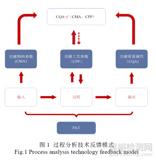 傳統(tǒng)中藥制造工業(yè)中,除了批生產(chǎn)結(jié)束后對藥品進行抽檢,制藥生產(chǎn)過程中各關(guān)鍵節(jié)點還需人工定期取樣進行離線檢測,以保證最終產(chǎn)品的質(zhì)量和療效,但這種質(zhì)量控制手段具有滯后性、局限性、取樣不完全具備代表性等問題。根據(jù)質(zhì)量源于設計(quality by design, QbD)理念與“全程質(zhì)量觀”,產(chǎn)品質(zhì)量是設計和生產(chǎn)出來的,通過“藥材源頭-制劑工藝-制藥裝備-中藥制劑”全過程質(zhì)量控制與追溯等手段,在保證藥品質(zhì)量均一穩(wěn)定方面更加科學有效[12]。PAT 旨在加強對生產(chǎn)過程的理解和控制,是QbD 理念中不可或缺的工具,通過PAT 實時識別和監(jiān)測關(guān)鍵工藝參數(shù)(critical process parameters, CPP)和關(guān)鍵質(zhì)量屬性(critical quality attributes, CQA),及時分析、反饋、控制生產(chǎn)過程可變性,見圖1,在原材料、工藝參數(shù)、制造環(huán)境和其他條件建立的設計空間中,可準確地預測產(chǎn)品質(zhì)量[13]。