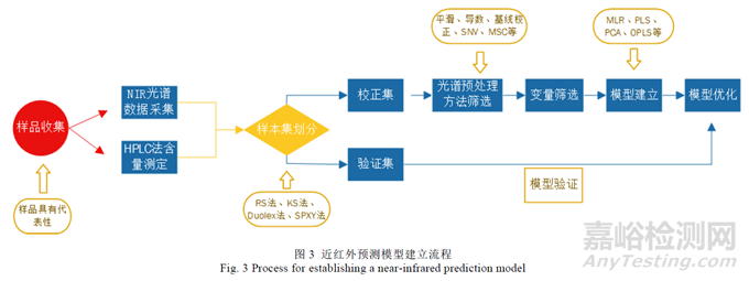 在光譜分析中,尤其是NIR 區(qū)域,其吸收強度弱且譜區(qū)重疊嚴重。此外,中藥成分多樣,近紅外光譜信息復雜。因此,用最簡單的最高點作為評估值是不確切的,需借助化學計量學方法從干擾嚴重的復雜光譜中提取信息,并建立定性或定量模型,把模型導入標準軟件來分析模擬信號,把分析數(shù)據(jù)轉(zhuǎn)換到集散控制系統(tǒng)(distributed control system, DCS)系統(tǒng)中去,形成生產(chǎn)控制信號,最終控制執(zhí)行元件(如溫控儀、閥門等)[20]。收集代表性樣品并采集近紅外光譜,建立近紅外檢測模型,步驟見圖3,模型建好后就可導入實際生產(chǎn)線中,實時在線監(jiān)測生產(chǎn)過程。模型預測準確度常用均方根誤差(root mean square error, RMSE)以及對應的決定系數(shù)(R2)來表示,一般RMSE 越接近0,R2 越接近1,模型預測準確性越高[21]。