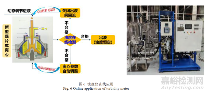 離心過濾是液體制劑的必要生產(chǎn)環(huán)節(jié),該步驟可去除一些不溶雜質(zhì)。碟片式離心機具有生產(chǎn)效率高、自動排渣等優(yōu)勢,是目前常用的離心設備之一,把濁度儀與碟片式離心機進行集成,實現(xiàn)濁度儀的在線應用,將檢測結(jié)果及時反饋至離心機控制系統(tǒng),調(diào)節(jié)設備參數(shù)控制,不合格產(chǎn)品進行二次離心、合格產(chǎn)品流入下一道工序,實現(xiàn)出液濁度恒定,保障產(chǎn)品質(zhì)量及生產(chǎn)連續(xù)性,見圖6。倪鴻飛等[46]針對銀參通絡膠囊關(guān)鍵工藝銀杏葉大孔樹脂純化過程,建立遺傳算法優(yōu)化的極限學習機定量分析模型,實現(xiàn)對洗脫液中槲皮素、山柰酚和異鼠李素3 種成分含量的近紅外光譜快速測定。王永香等[47]測定樣本中新綠原酸、綠原酸、隱綠原酸及固含物的量,應用統(tǒng)計過程控制技術(shù)建立4 個指標的定量放行標準,并采用中心組合設計制備13 個批次不同工藝條件下的青蒿金銀花醇沉樣本作為驗證集,驗證定量實時放行標準的準確性,結(jié)果表明建立的單變量過程統(tǒng)計方法能更好地監(jiān)控生產(chǎn)過程,對終點樣本進行判斷,達到實時放行的目的。