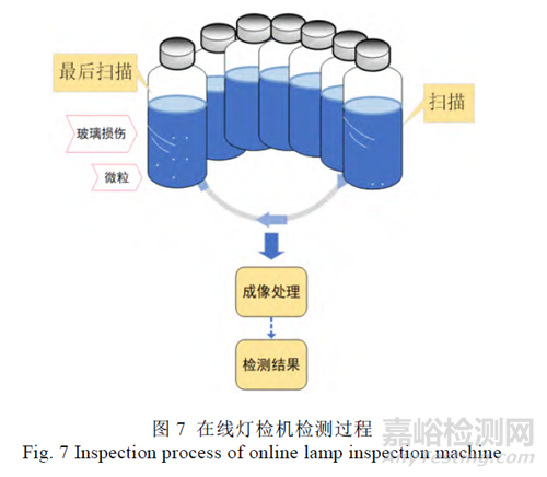 液體制劑在罐封過程中,可能會出現(xiàn)藥液中混入雜質(zhì)、罐裝瓶破損或出現(xiàn)劃痕等問題,需要對瓶身外觀缺陷及藥液中雜質(zhì)進行檢測。在線燈檢機采用高速視覺相機對藥液雜質(zhì)和瓶身外觀瑕疵進行快速識別,燈檢機工作時將每個瓶子高速旋轉(zhuǎn),再突然停下,利用液體運動的慣性,瓶子停在光電系統(tǒng)時微粒和液體還在運動狀態(tài),處理器偵測液體中的懸浮物質(zhì),在線實時獲得被檢測物的實際影像,同時顯示檢測結(jié)果[48]。檢測過程見圖7。對比傳統(tǒng)人工燈檢的方法,在線燈檢機不僅檢測效率高而且穩(wěn)定可靠,其漏檢率和誤檢率非常低,還可避免人工長期燈檢后用眼疲勞問題。此外,所有燈檢圖像及統(tǒng)計數(shù)據(jù)實時儲存在硬盤上或輸出至生產(chǎn)實施系統(tǒng)(manufacturing execution system, MES),可形成電子批紀錄或用于燈檢質(zhì)量大數(shù)據(jù)分析。