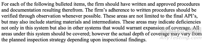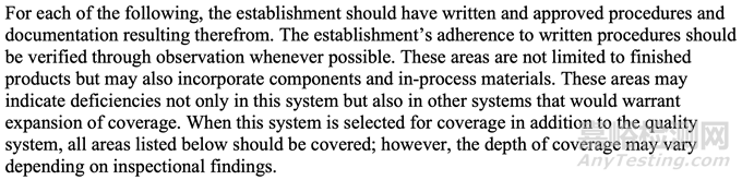 同樣,在質(zhì)量體系和其它每個體系的檢查重點之前,也有要有書面程序、發(fā)現(xiàn)的缺陷可能關(guān)系到其它體系的缺陷等等這樣一段話: