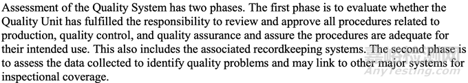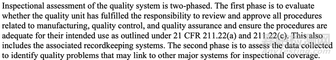 對質(zhì)量體系的檢查評估分兩個階段。第一階段是評估質(zhì)量部門是否有充分的職責去審核和批準所有與生產(chǎn)、質(zhì)量控制和質(zhì)量保證相關(guān)的程序并確保程序充分適合于其預(yù)期的用途,包括相關(guān)的記錄保存系統(tǒng);第二階段是評估收集的數(shù)據(jù)來發(fā)現(xiàn)質(zhì)量問題。而這些質(zhì)量問題可能鏈接至檢查范圍內(nèi)的其它主要體系。