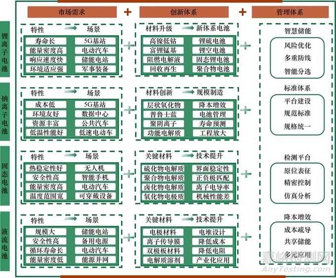 關(guān)鍵材料研究是發(fā)展電化學(xué)儲能技術(shù)的基礎(chǔ)。當(dāng)前的儲能材料研發(fā)高度依賴研究者的“嘗試法”實驗、積累經(jīng)驗與科學(xué)直覺,實驗室研究也無法滿足各類應(yīng)用場景對儲能器件能量密度、功率密度、循環(huán)壽命的需求。需要采取由應(yīng)用驅(qū)動的“逆向思維”來設(shè)計材料結(jié)構(gòu)。發(fā)揮大數(shù)據(jù)、人工智能技術(shù)對相關(guān)模擬計算的賦能作用,面向各類具體應(yīng)用場景,針對性開展儲能系統(tǒng)、儲能器件、關(guān)鍵材料設(shè)計并挖掘有效組合;以基礎(chǔ)技術(shù)創(chuàng)新提高電池材料和組件的研發(fā)水平,促進(jìn)電池的優(yōu)質(zhì)制造與規(guī)?;渴?。在工業(yè)應(yīng)用背景下開展相關(guān)基礎(chǔ)研究,立足現(xiàn)實條件對新材料及組件技術(shù)進(jìn)行交叉驗證,加快確定科學(xué)的選材方向以加速推動電池技術(shù)演進(jìn)。