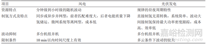 風(fēng)電和光伏發(fā)電均可通過多臺(tái)機(jī)組并機(jī)的方式降低發(fā)電的波動(dòng),但依然無法避免因風(fēng)力或者太陽(yáng)輻照變化導(dǎo)致的電力輸出波動(dòng),這就對(duì)制氫系統(tǒng)產(chǎn)生了波動(dòng)性負(fù)荷輸入。在較短的時(shí)間尺度下,風(fēng)電表現(xiàn)為分鐘級(jí)到小時(shí)級(jí)的隨機(jī)波動(dòng),光伏發(fā)電則為基本的晝夜周期特性(見表1)。