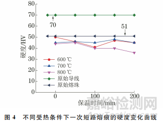 表3為不同受熱條件下一次短路熔痕的硬度測試結(jié)果,圖4為不同受熱條件下一次短路熔痕的硬度變化曲線。由表3和圖4可知:一次短路熔痕硬度低于未熔化的導(dǎo)線基體;隨著受熱溫度的升高及保溫時(shí)間的延長,熔痕硬度呈現(xiàn)逐漸降低的趨勢,這一過程符合純銅在退火狀態(tài)下力學(xué)性能與溫度的關(guān)系;當(dāng)受熱溫度為800℃,保溫時(shí)間為100min時(shí),一次短路熔痕的硬度明顯下降,說明熔痕內(nèi)的胞狀晶已完成再結(jié)晶,由排列較為致密的細(xì)小胞狀晶轉(zhuǎn)變?yōu)榇缶Ы缰鶢罹?。晶界?shù)量降低和晶粒形態(tài)轉(zhuǎn)變會(huì)導(dǎo)致熔痕的硬度進(jìn)一步降低。
