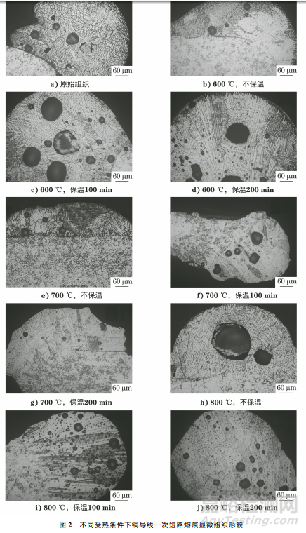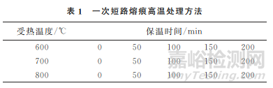 使用可控溫箱式電爐,參照表1分別對(duì)銅導(dǎo)線一次短路熔痕進(jìn)行高溫處理。電爐的升溫速率為20℃/min,爐溫穩(wěn)定度為±3℃,然后對(duì)處理后的熔痕試樣進(jìn)行空冷。